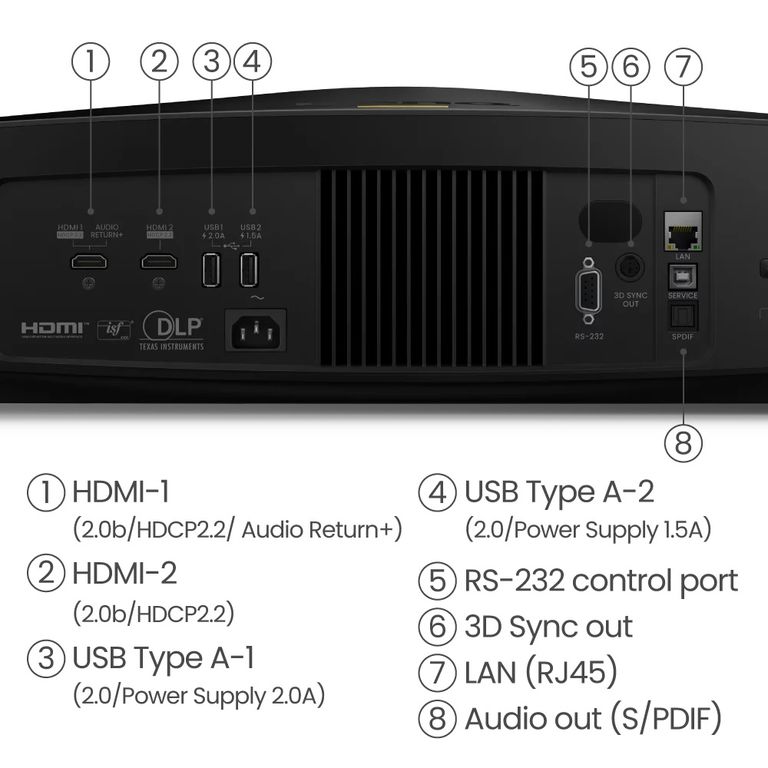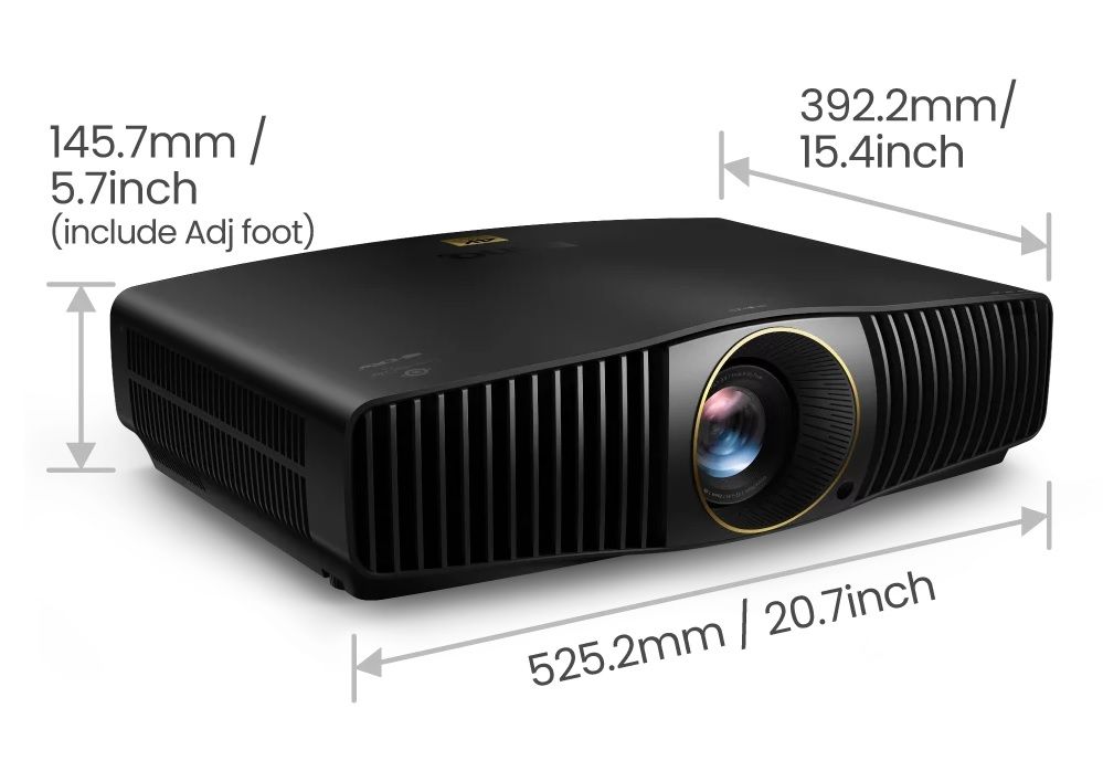 Лазерный 4K лазерный проектор. Технология DLP цветовое колесо RGBRGB, разрешение 4K UHD 3840×2160, контрастность 2 000 000:1, яркость 2600 ANSI люменов, проекционное расстояние 1.52-2.45, срок службы лазера 20000 часов. Покрытие 100% REC.709, 100% DCI-P3. Поддержка HDR10. Сдвиг обьектива вертикальный ± 50%/ горизонтальный ± 50%. Потребляемая мощность 450 Вт, подходит для больших экранов. Размер ШВГ 525.2x145.7x392.2 Вес 10,5 кг.